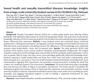 –         Bài báo trong nước trong hội đồng chức danh Nhà nước hoặc một bài SCOPUS: Sexual Health and Sexually Transmitted Diseases Knowledge: Insights from a Large-Scale University Student Survey in Ho Chi Minh City, Vietnam; Tạp chí Y Dược Huế, 15(4), 61–70. https://doi.org/10.34071/jmp.2025.4.9