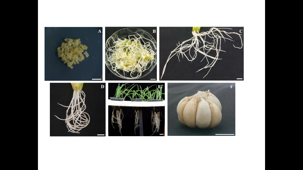 Hình các mẫu tỏi được tạo thành trong nghiên và mẫu củ tỏi trồng ngoài tự nhiên dùng để chuẩn bị dịch chiết kháng vi khuẩn Vibrio spp: (A) Mô sẹo; (B) Rễ bất định; (C) Rễ tơ in vitro; (D) Rễ nuôi cấy in vitro (không xâm nhiễm A. rhizogenes); (E) Rễ thủy canh; (F) Củ tỏi trồng ngoài tự nhiên. Thước tỷ lệ = 1 cm.